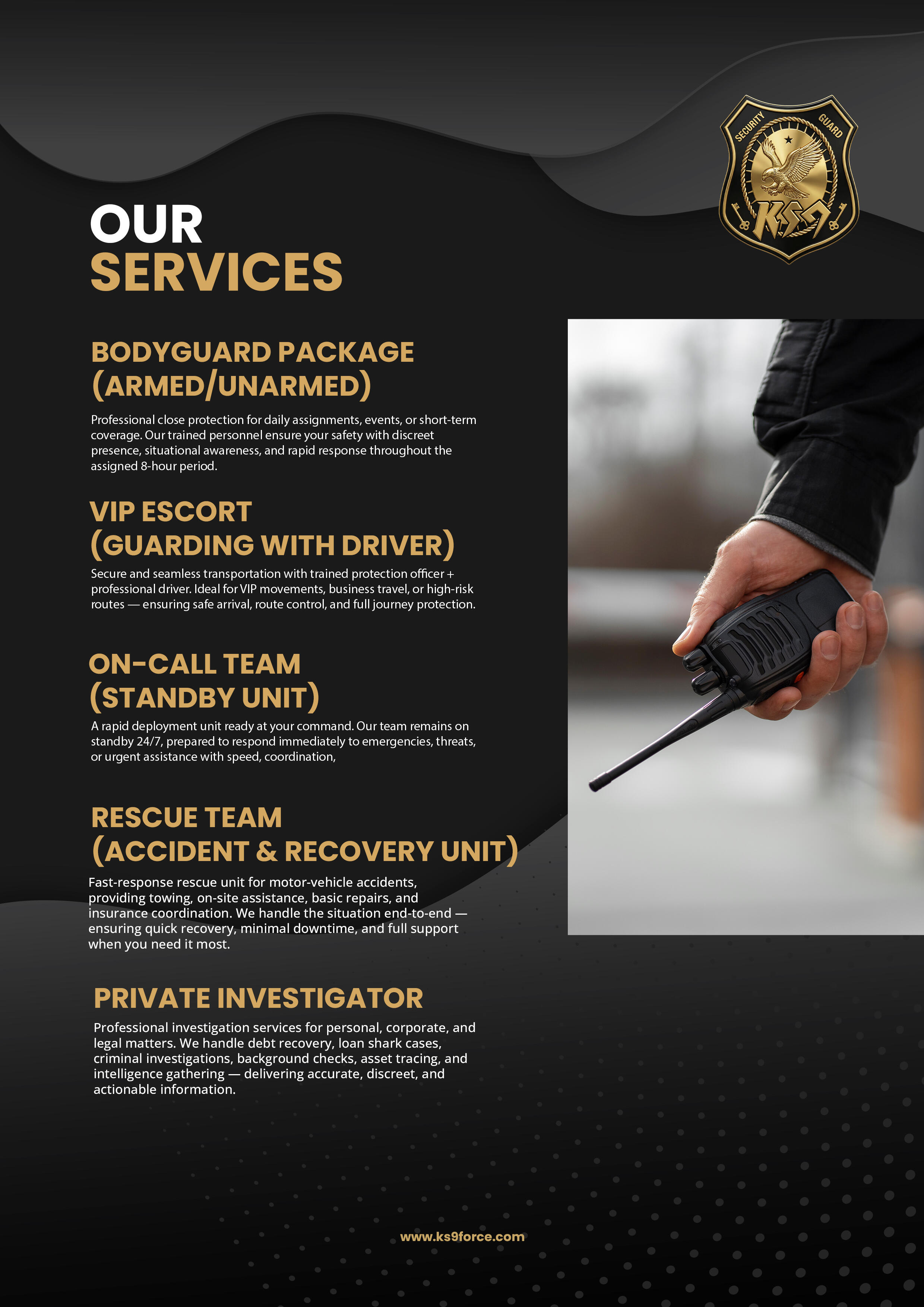 Whether you require personal security, convoy protection, or immediate accident response, KS9 Force stands ready 24/7 — ensuring safety, control, and peace of mind when it matters most.